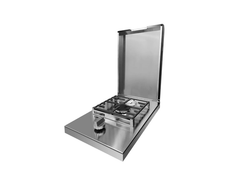 Innebygd gassbluss med hurtigbrenner, støpejernsgitter og lokk i rustfritt stål og metallvrider gir en følelse av et proffkjøkken og er veldig praktisk for deg som ikke har plass til en stor gasstopp ute men vil ha en fleksibilitet med ekstra bluss ute.